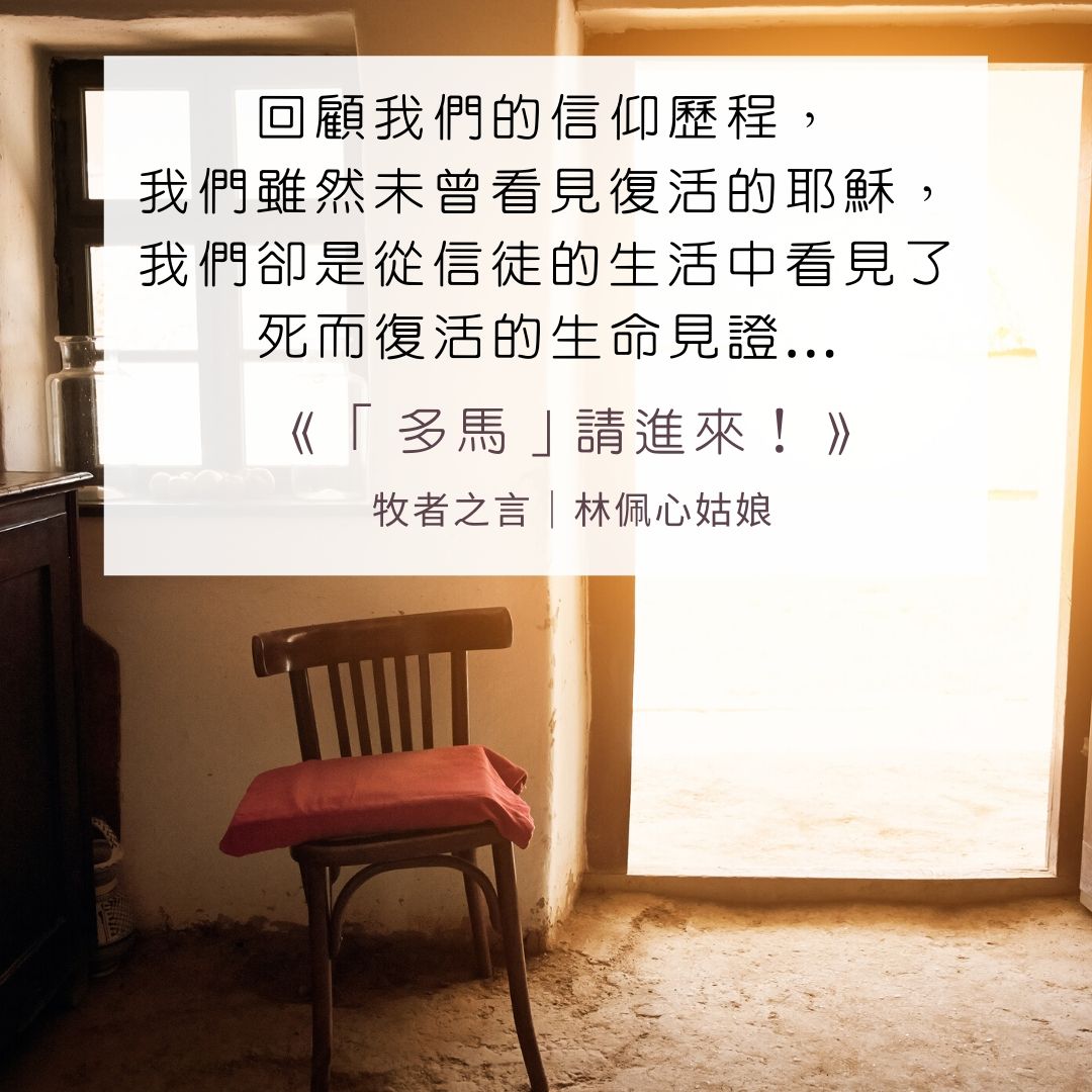 我們不知道主何時再來,但我們可以建造一個復活的群體,讓復活主的能力彰顯在我們中間,讓我們效法昔日的門徒,歡迎和接納那些信心不足又多疑的朋友,使「多疑的多馬」經過掙扎和經歷後,成為「信心的多馬」。