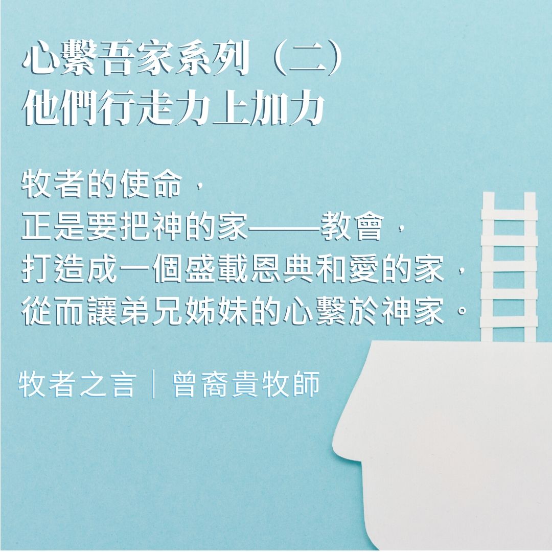 牧者的使命,正是要把神的家——教會,打造成一個盛載恩典和愛的家,從而讓弟兄姊妹的心繫於神家。不知大家有否留意到,外語肢體每週敬拜時所展現的開心和活潑?她們有為數不少的人,在前來香港工作後才認識神。她們能夠在香港這異鄉信主,是我們本地肢體值得感到驕傲的。因為我們不用遠赴別國,就能把福音傳播到她們的心靈,使她們成為基督的門徒。她們有如詩人描述般,活現出一幅朝聖的圖畫:各人力上加力,每週來到禮拜堂中朝見神!
