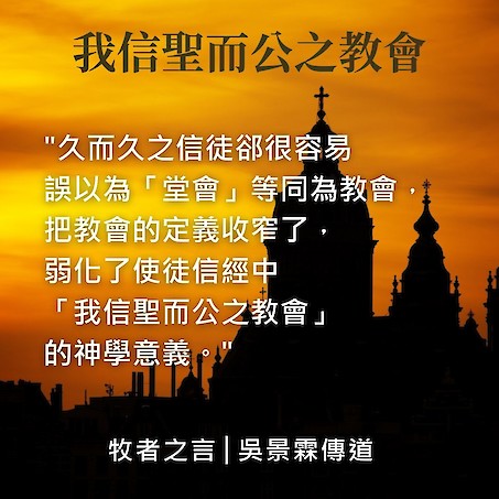 我們每一個主日,都會背頌使徒信經,但是卻是較少教導有關使徒信經的內容,亦未必人人明白使徒信經背後的神學,因此想和大家分享「我信聖而公之教會」這一句的意義。