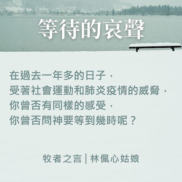 在肺炎疫情和社會運動仍未能看見明朗的這刻,讓我們珍惜與主的親密關係,憑歌寄意向祂傾訴我們的「苦情」,使我們能夠得著那等候的耐力:「就是少年人也要疲乏困倦,強壯的也必全然跌倒;但那等候耶和華的,必從新得力。他們必如鷹展翅上騰,他們奔跑卻不困倦,行走卻不疲乏。」(賽40:30-31)