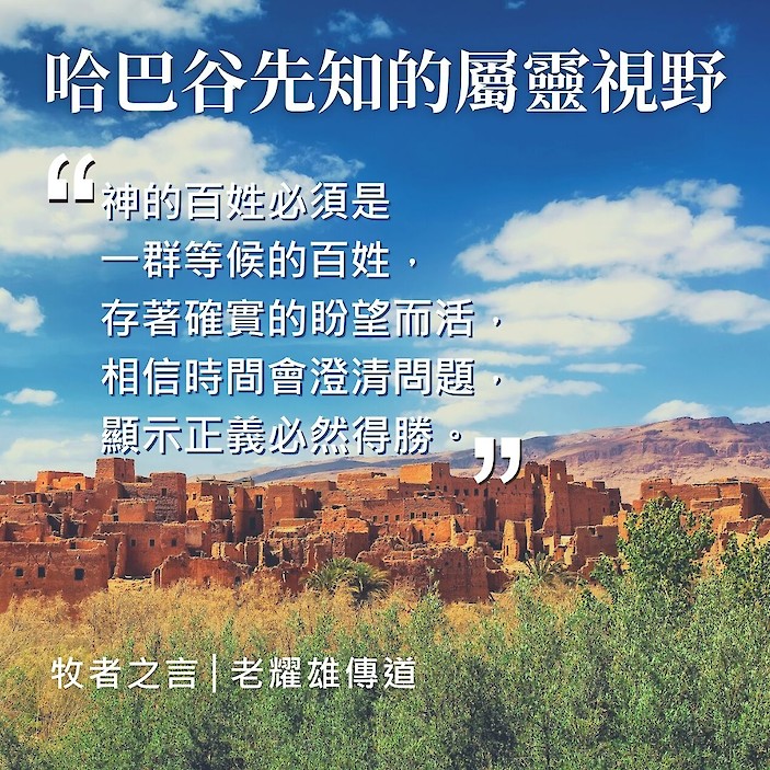 我們很熟悉的先知哈巴谷亦處身於這個舞台之上,他與其他先知有所不同,一般先知是被神差到百姓中間來服事,而哈巴谷卻把自己和同胞的困惑帶到神面前。他所關注的是神的公義,如果神真是美善、公正、和掌權的,邪惡怎可能存在 ? 人生中許多不平的事大大的困擾著他。邪惡的存在構成他信心上的難處,怎可以容許罪惡這麼囂張 ? 怎可讓惡人吞滅比自己公義的人 ? 在痛苦的掙扎中,哈巴谷坦誠地、率直地向神申訴,要求回答。