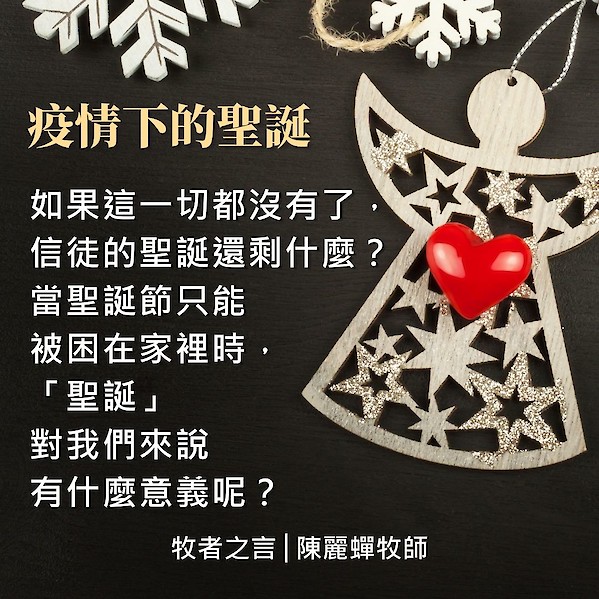 現代人追求感覺,講究氣氛。若沒有燦爛燈飾、歡愉樂曲、美味大餐、窩心禮物,聖誕仍可喜樂嗎!如果這一切都沒有了,信徒的聖誕還剩什麼?當聖誕節只能被困在家裡時,「聖誕」對我們來說有什麼意義呢?