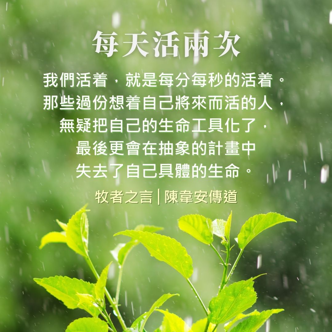 享受生命,正是我們這年代之子要重新拾回的恩賜。是的,我們沒有回到過去的能力,也沒有重活每天的奢華。不過,耶穌基督卻叫我們擁有「新生命」重新活着(林後5:17)。我們經驗基督裏的「新生命」,不一定是硬崩崩「再一次」的活着,卻是真真正正的「新」生命。這「新」生命叫我們有放膽、勇敢地享受此刻的生命 — 哪怕我們不能預知、也不能重回這生命 — 我們卻都有權「每天清晨都是新的」地活着、享受着。