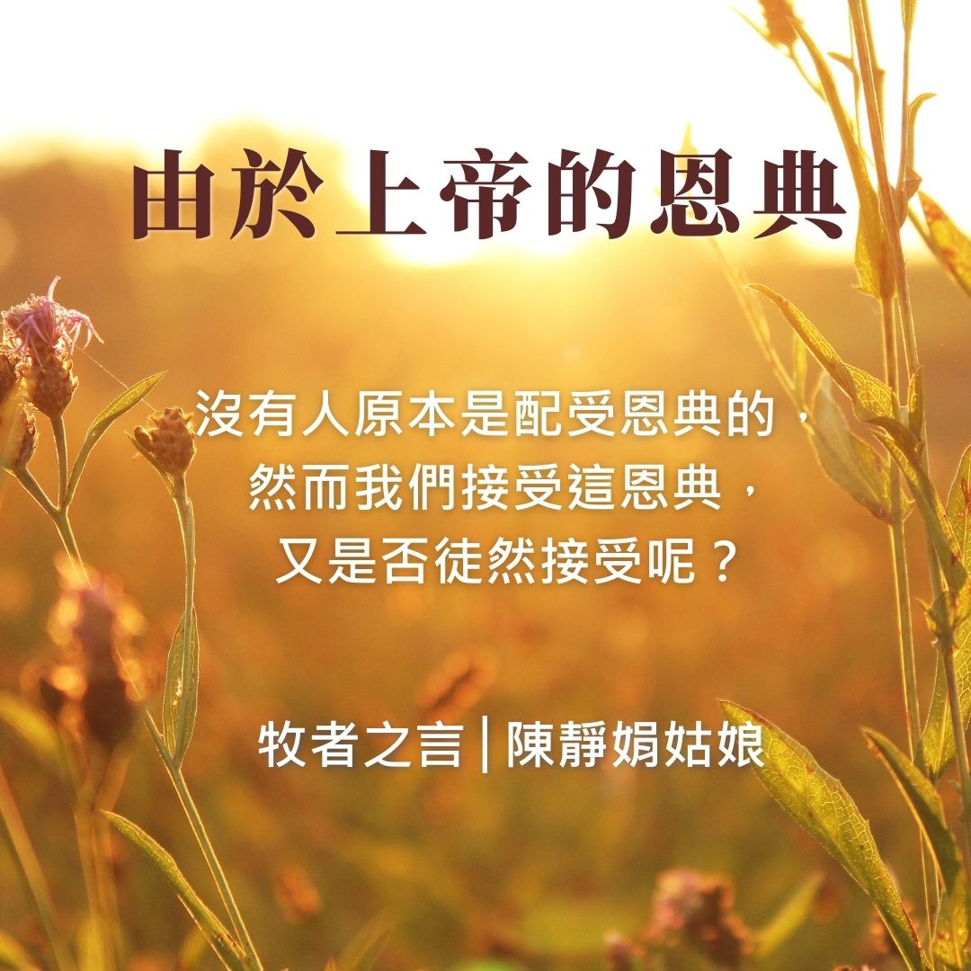 在以上經文,使徒保羅三次提到「恩典」,他說「由於上帝的恩典,我才成了今日的我」,並且「在外邦人和君王並以色列人面前,宣揚主的名。主也指示他,為主的名必須受許多的苦」(徒9:15-16)。同樣,我們作為上帝的兒女,也是由於上帝的恩典,才成了今日的我們。這恩典得來不易,是主耶穌用祂的血去贖回我們的生命,是上帝主動拯救我們!沒有人原本是配受恩典的,然而我們接受這恩典,又是否徒然接受呢?
