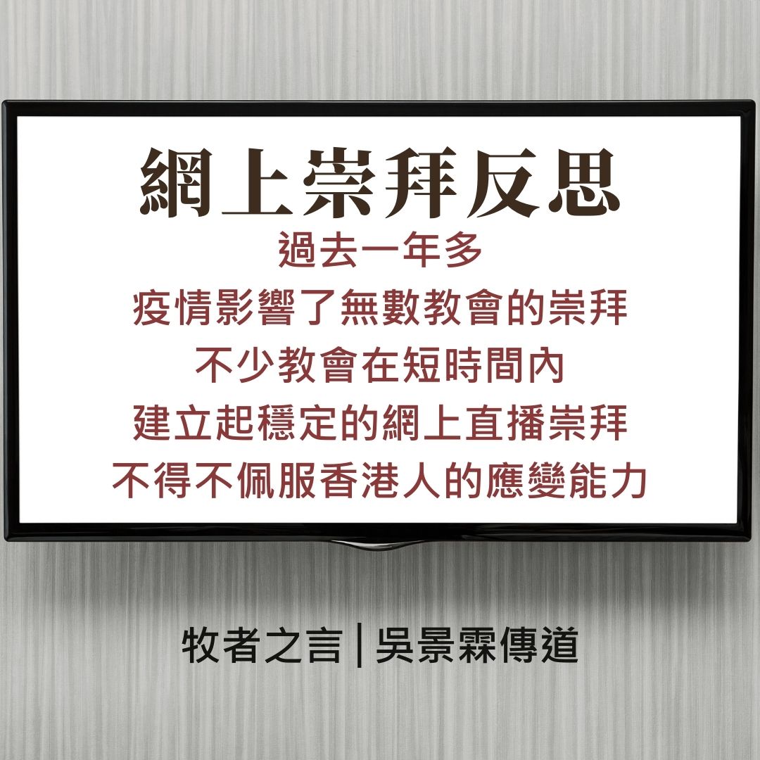但以我所知,有些肢體參與網上崇拜時,其實並不會完全遵守崇拜的禮序。例如:主席呼籲大家站立禱告的時候,他們還是安座於梳化,頂多只是合上眼睛跟隨祈禱。這很值得我們反省,網上崇拜是否正在弱化我們尊敬神的態度?