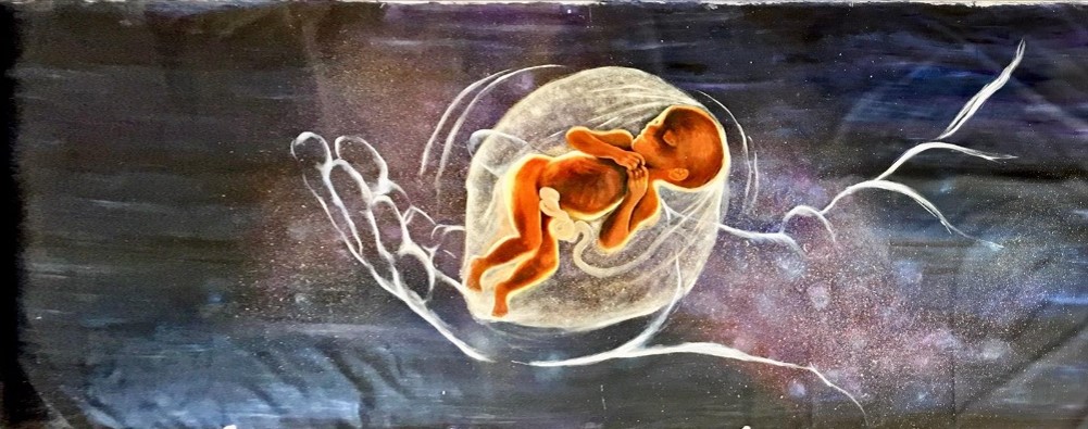 畫的底色是黑漆漆的,我想是象徵罪惡的世界,其上有很多彩色光點,應是代表神的恩典;越近圖中的巨手,彩色光點越多,應是象徵在神手中,恩典滿滿吧!當聆聽其他同學分享時,訝異他們觀察力、想像力是何等的豐富!反思到,人若能謙卑下來,與他人多互相切磋、觀摩,原來能擴闊視野,對自己的思想、角度、觀點都有益處的。大部分同學都對那巨手中的胎兒有很大的領受,我發現我完全忽略畫中的焦點 — 胎兒!其實,我一進入課室,我就看見了《它》,但《它》太難看了,有點恐怖感,非常抗拒;心中暗地怪責誰放這畫在教室內、也擔心著要面對《它》整個上午,誰知是整日都要見《它》、圍繞《它》、默想《它》!!!後來我發現,原本在不同角度看這胎兒時,《它》有不同的形態的;有見到《它》在滿足地微笑、又有見到《它》在雀躍地跳舞,好可愛的;反思到處理事情時也一樣,不同角度有不同看法,不要固執己見,總要「心存謙卑,各人看別人比自己強。」