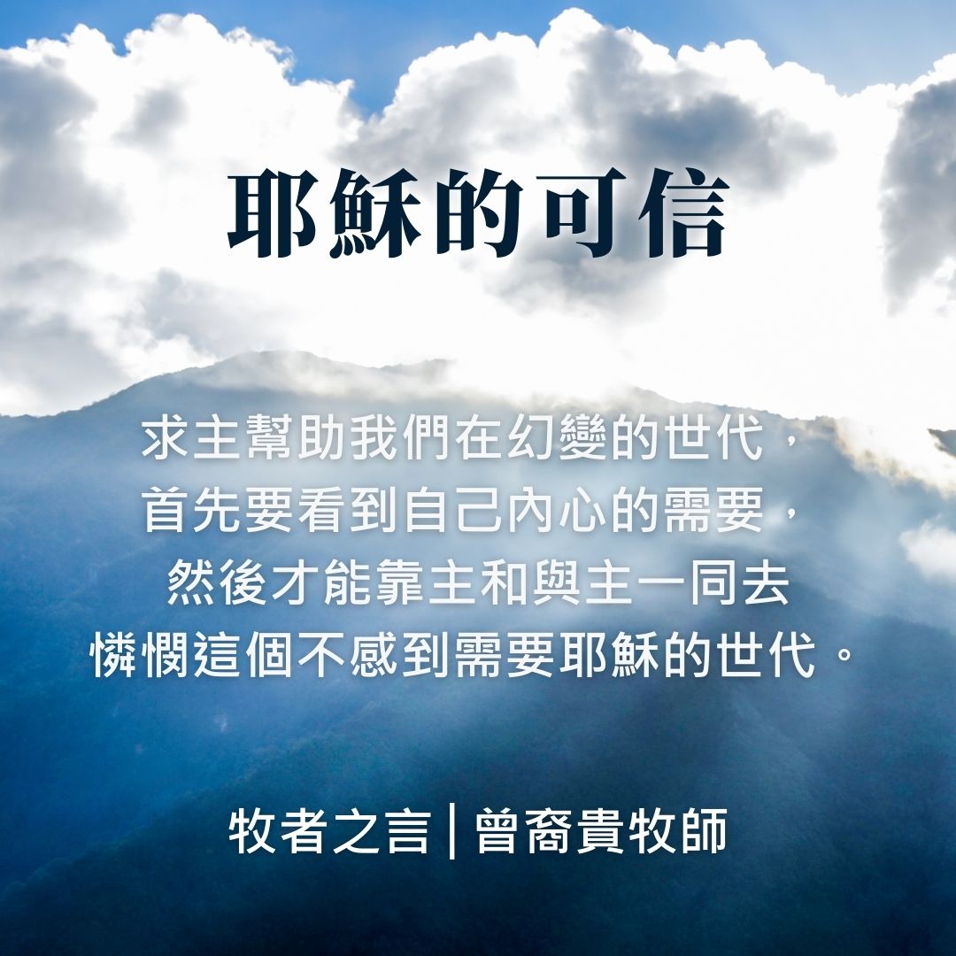求主幫助我們在幻變的世代,首先要看到自己內心的需要,然後才能靠主並與主一同去憐憫這個不感到需要耶穌的世代。