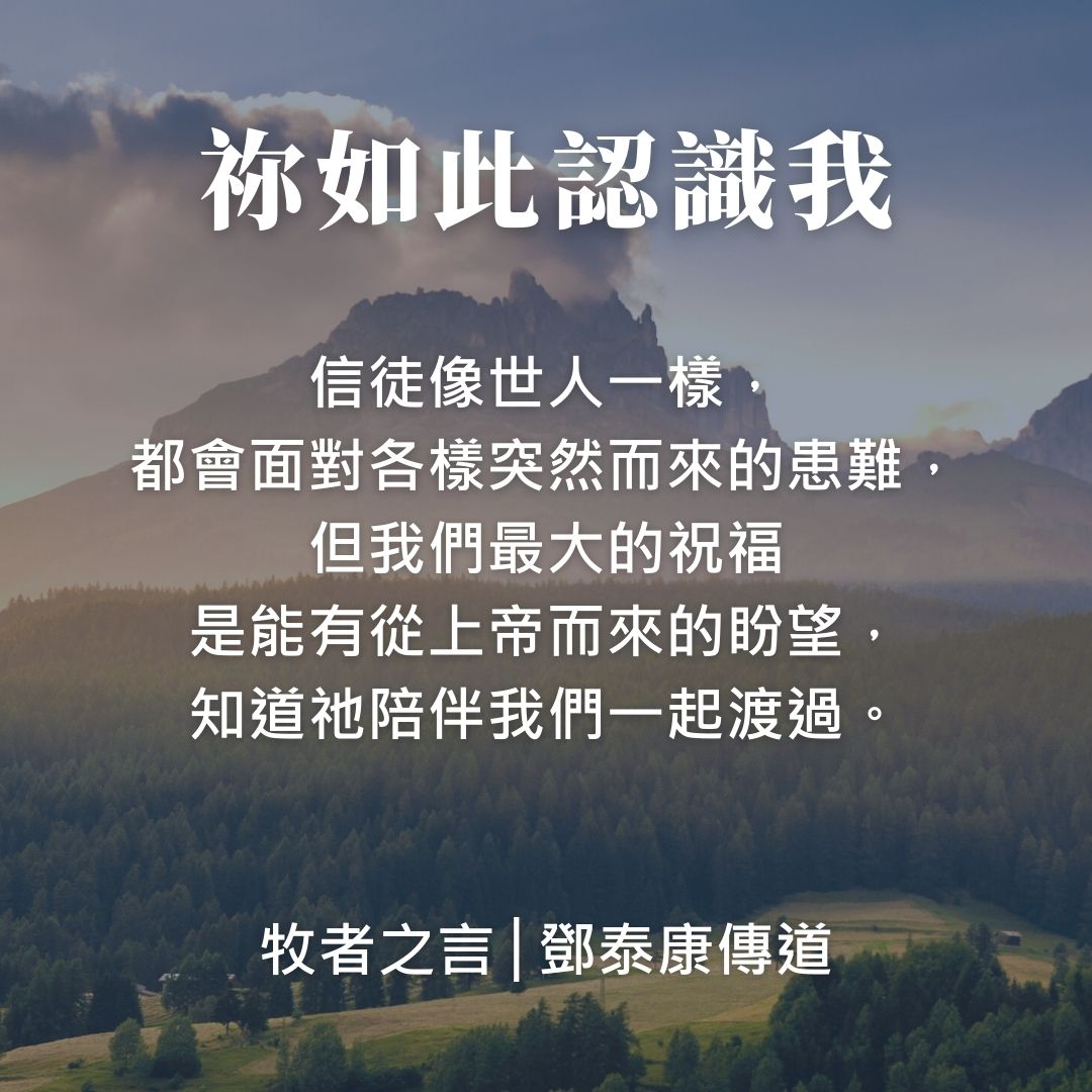 昨晚筆者去探訪一對很久未有見面的肢體夫婦,在彼此分享中,剛巧筆者也正面對一個不容易的難關,請他們也禱告記念。分享後,弟兄這樣跟我說:『你就是經歷了這些事,才有見證與肢體分享嘛!』這句話在正面對難處時,是不容易接受的,但卻又是真實的。信徒與主建立緊密關係最深的場景,豈不都是在患難中,祂引領我們渡過的時候嗎?今天活在世上,信徒最主要的目標,不都是彰顯祂的榮耀,讓更多人靠近主嗎?如果沒有了這些經歷,我們傳的都只是頭腦的聖經知識。如果我們都能相信這些患難都只是上帝使用的工具,那我們就不用懼怕,因為祂一直都掌管著。保羅曾在哥林多前書10章13節說:『你們所遇見的試探,無非是人所能受的。神是信實的,必不叫你們受試探過於所能受的。在受試探的時候,總要給你們開一條出路,叫你們能忍受得住。』信徒像世人一樣,都會面對各樣突然而來的患難,但我們最大的祝福是能有從上帝而來的盼望,知道祂陪伴我們一起渡過。最後送一首詩歌給大家,在困難中,盼望成為我們的提醒及安慰。