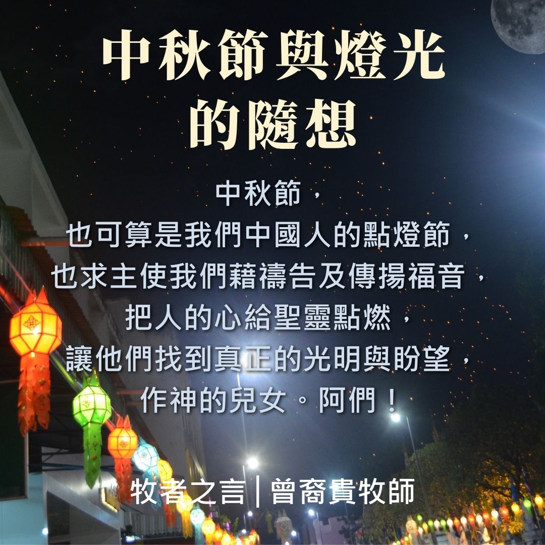 中秋節,也可算是我們中國人的點燈節,也求主使我們藉禱告及傳揚福音,把人的心給聖靈點燃,讓他們找到真正的光明與盼望,作神的兒女。阿們!