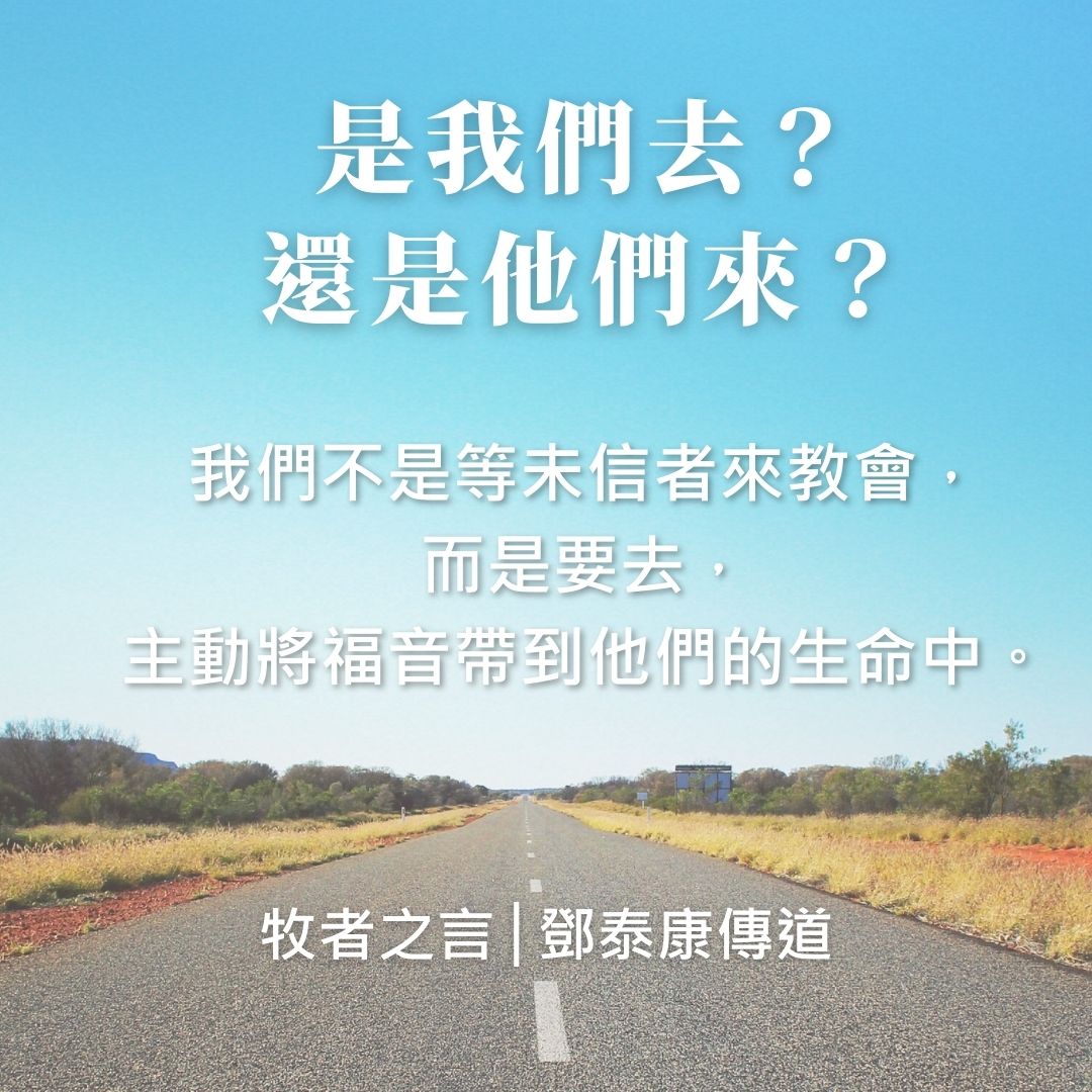 福音工作不是將未信朋友帶來教會交給傳道牧者︰主耶穌並不是只呼召傳道牧者去做福音的工作,而是呼召所有跟隨祂的信徒去傳福音(當然包括傳道牧者),所以信徒並不只是福音的橋樑、中介人、邀請者;每一個信徒都是傳道者,我們都必須裝備好自己,有作見證的生命及傳揚福音的能力,每一個信徒都可以成為初信朋友的牧者,逐步帶領他們接受洗禮及遵行主耶穌的教訓。當然傳道牧者受呼召在教會作全時間的事奉,有我們特定的角色及責任,但我們絕對無法取代每一位信徒被呼召去作見證及傳揚福音的身份。所以,我們不是等未信者來教會,而是要去,主動將福音帶到他們的生命中。到末後交賬的時間,每位信徒都需要為自己所作的工負責。