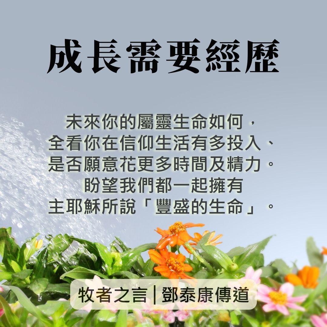 這篇文章刊登時,應該剛好是浸禮的日子。各位受浸的弟兄姊妹:今天不是你信仰的畢業禮,反而是信仰的新起點。未來你的屬靈生命如何,全看你在信仰生活有多投入、是否願意花更多時間及精力。盼望我們都一起擁有主耶穌所說「豐盛的生命」。