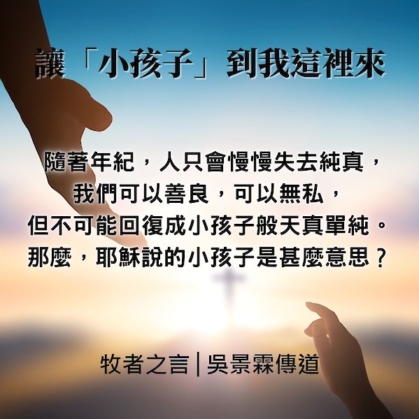 「小孩子」其實是「不被接納」的一群,但耶穌說在神國正是這樣的人!人之所以能進天國,非因自身的力量或貢獻,只是單純的因為神的恩典!就如小孩子只能依賴成年人一樣,我們也只能依賴神的恩典,才能得著永生。