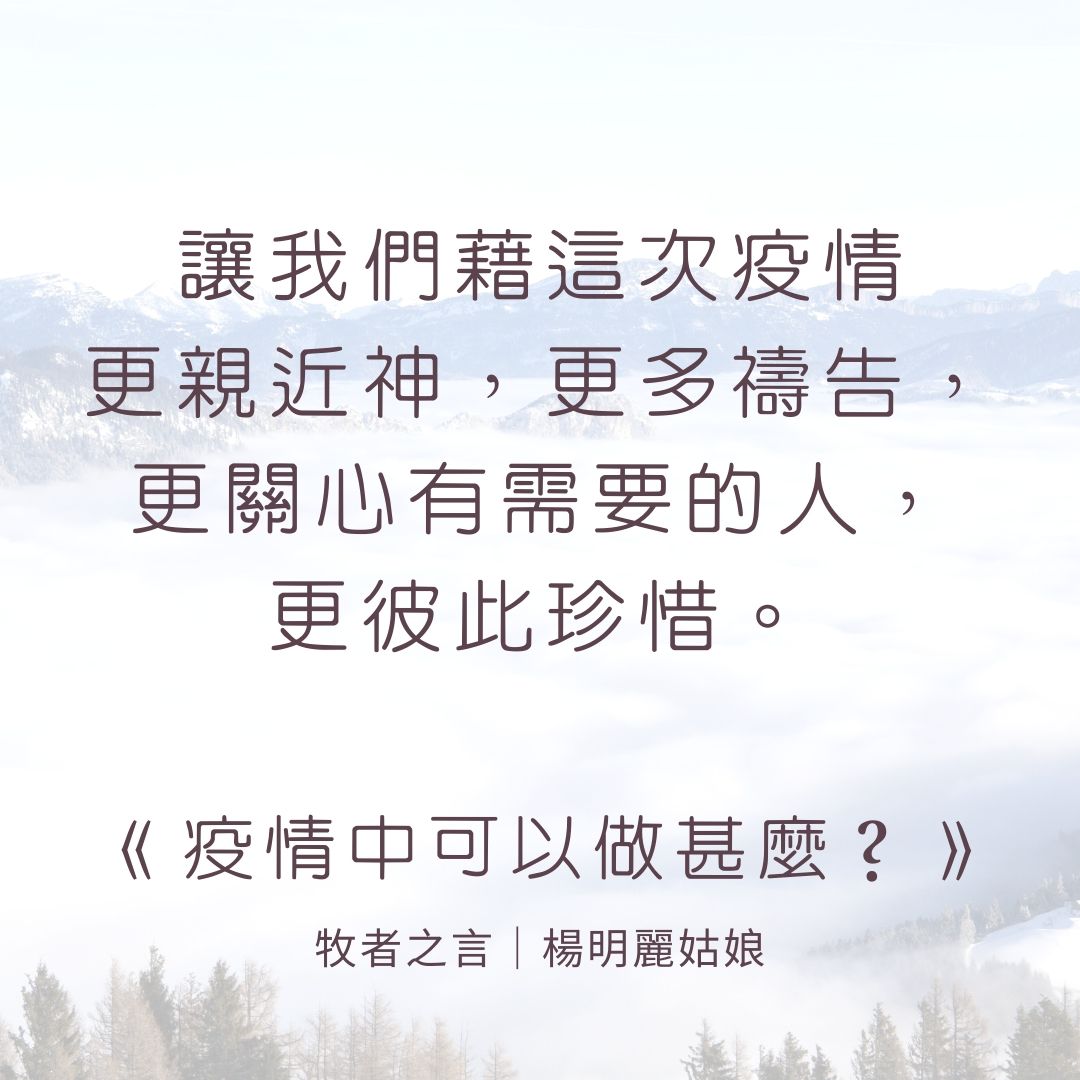 借用梁家麟牧師一句話:「不要浪費了這次疫情。」讓我們藉這次疫情更親近神,更多禱告,更關心有需要的人,更彼此珍惜。讓我們在家中藉網上的崇拜直播,同心地敬虔聚會,把崇拜獻呈給父神。願父幫助我們,賜下恩典和平安,讓我們安然面對目前的困難和挑戰。